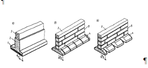 Ленточные фундаменты: а) – монолитный; б) – сборный сплошной; в) – сборный прерывистый; 1 – армированная лента; 2 – фундаментная стена; 3 - стена здания; 4 – фундаментная подушка; 5 – стеновой блок.