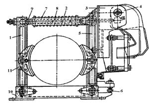 1, 5 – вертикальные рычаги; 2 – скоба; 3 – короткоходовой электромагнит; 4 – якорь; 6 – головка болта; 7, 9 – пружины (основная и вспомогательная); 8 – шток; 10 – основание; 11 – колодки.