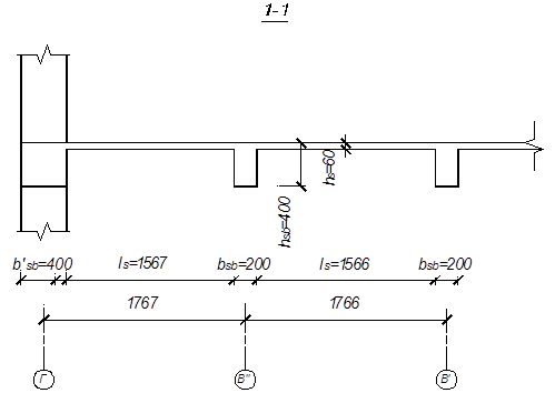 В монолитном ребристом перекрытии принимаем поперечное расположение главных балок по внутренним разбивочным осям. Второстепенные балки размещаются в продольном направлении здания по осям столбов и в третях пролетов главных балок с шагом 1750 мм.